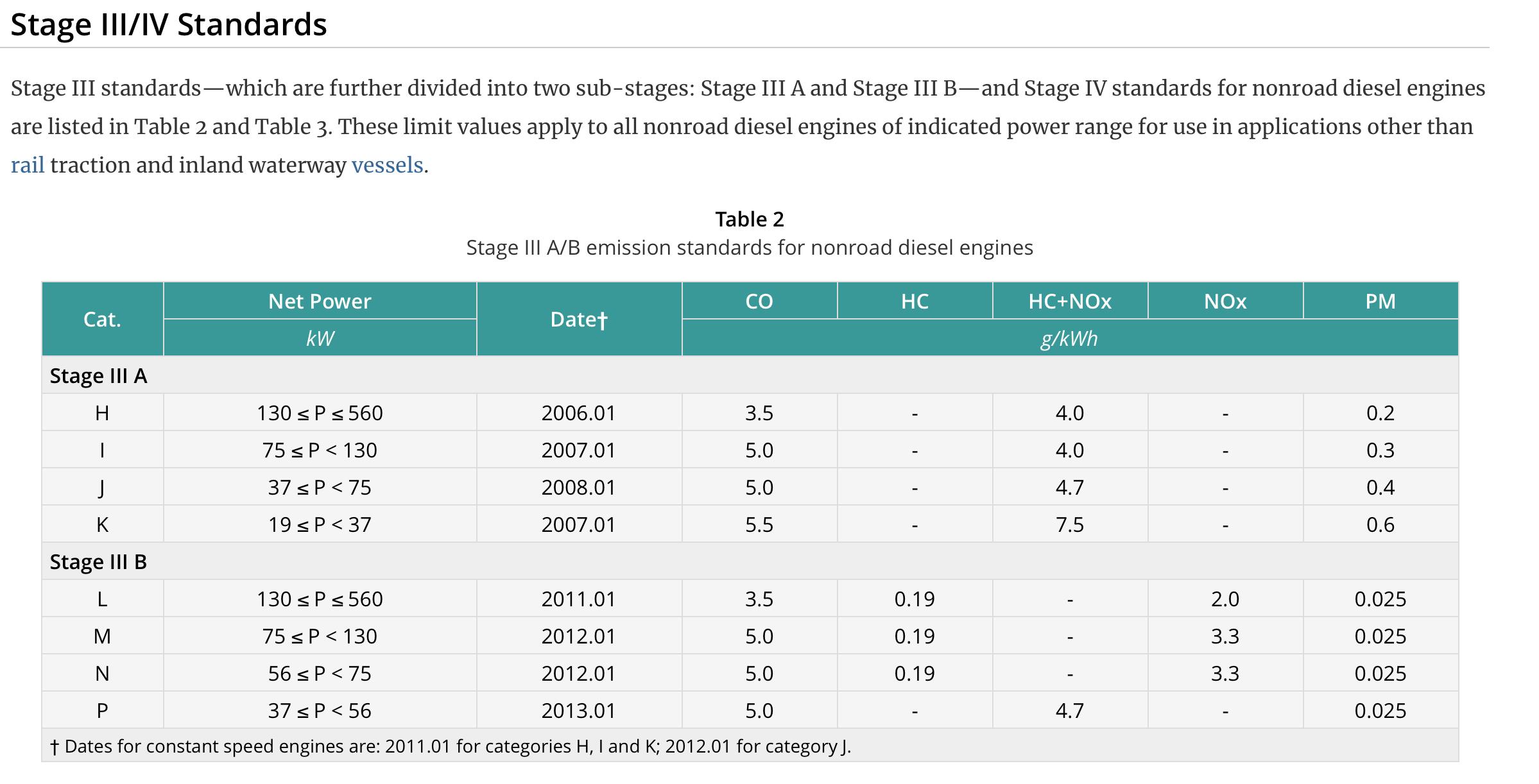 EURO STAGE IIIA / IIIB EMISSION DATA COMPARISON, reference: https://dieselnet.com/standards/eu/nonroad.php
